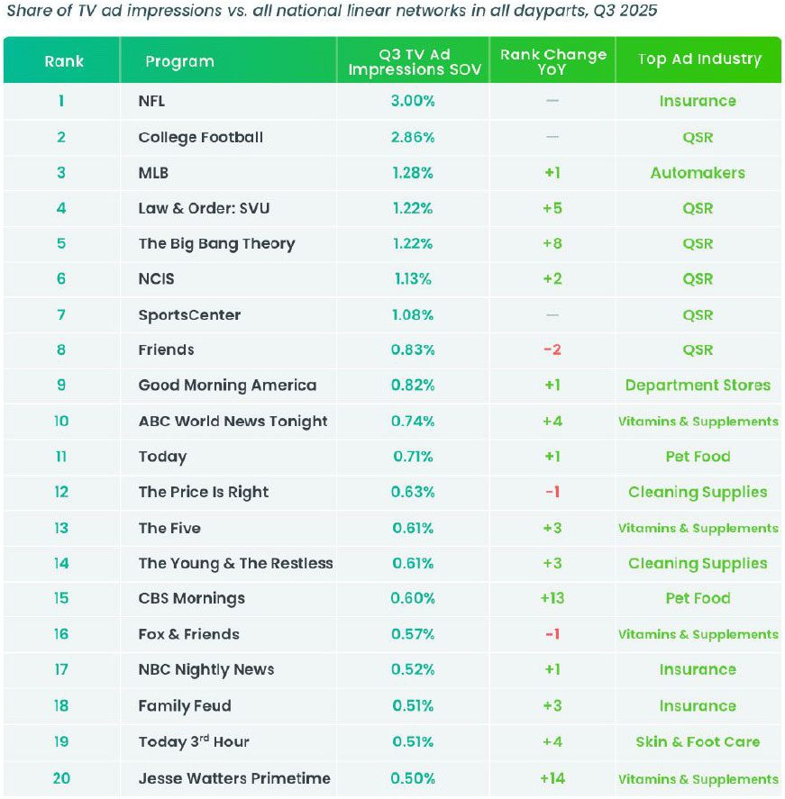 TV ad impressions for the NFL grew by over 12% year-over-year in 3Q25, and college football jumped by more than 16%, according to iSpot’s analysis of national linear TV advertising. The NFL’s estimated national TV ad spend rose by 9.7% year-over-year, and college football was up 22.5%. Additional findings include: