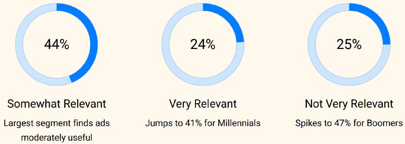 | There’s a dramatic generational divide when it comes to how consumers perceive advertising relevance, according to a study from MX8 Labs. While 69% of consumers overall report seeing at least somewhat relevant ads, 41% of Millennials found ads “very” relevant, compared to just 24% of the general population. Meanwhile, 47% of Boomers found ads “not very” relevant. |
