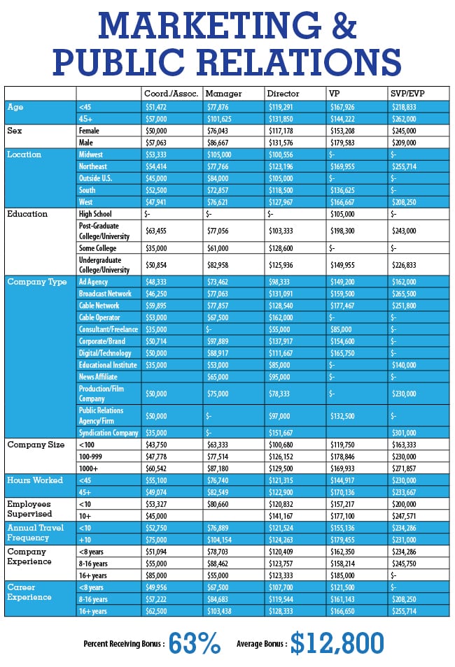 Bonus pay for marketing and public relations professionals is typical of what’s seen throughout the rest of the television industry for both frequency and dollar amounts—63 percent of respondents say they received a bonus in 2014, for an average of $12,800.