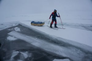 Explorer Ryan Waters skis on thin ice with his sled in tow.