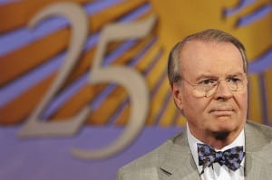 caption: Celebrating 25 years of CBS NEWS SUNDAY MORNING, anchor Charles Osgood catches some of the show’s signature rays on the set after a recent broadcast. The show will reach its milestone broadcast on January 24, 2004.
