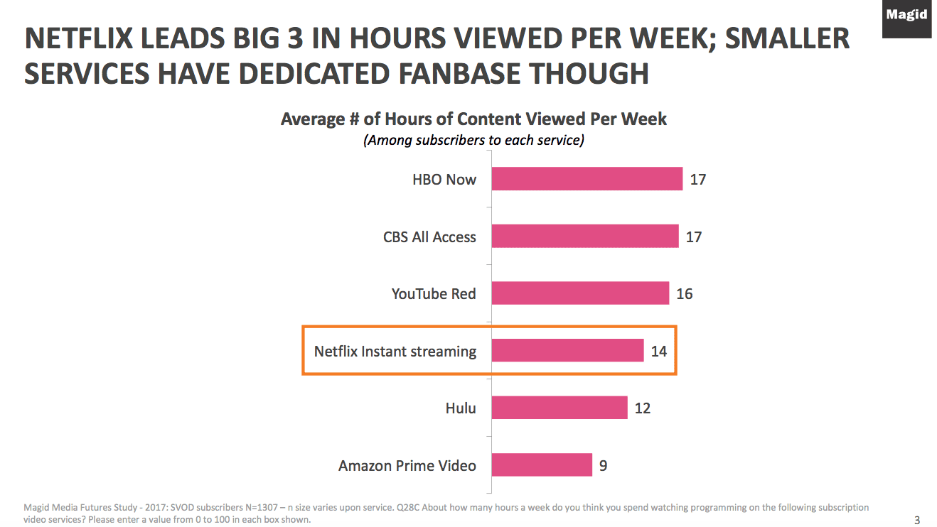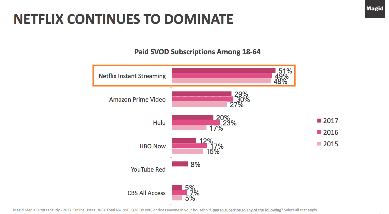 How will higher subscriber fees affect Netflix? Magid’s annual Media Futures study shows the importance of SVOD content, the dedication of the audience, and the increasing household penetration of internet-connected TVs – and a while it may cost more to watch Stranger Things, Orange Is the New Black, The Crown, as the streaming service just raised fees for new subscribers and is in the process of transitioning current HD customers to more expensive pricing, the price hike is unlikely to impact customer loyalty or cause subscribers to seek out other forms of content, says Jill Rosengard Hill, EVP at Magid. Here’s why: