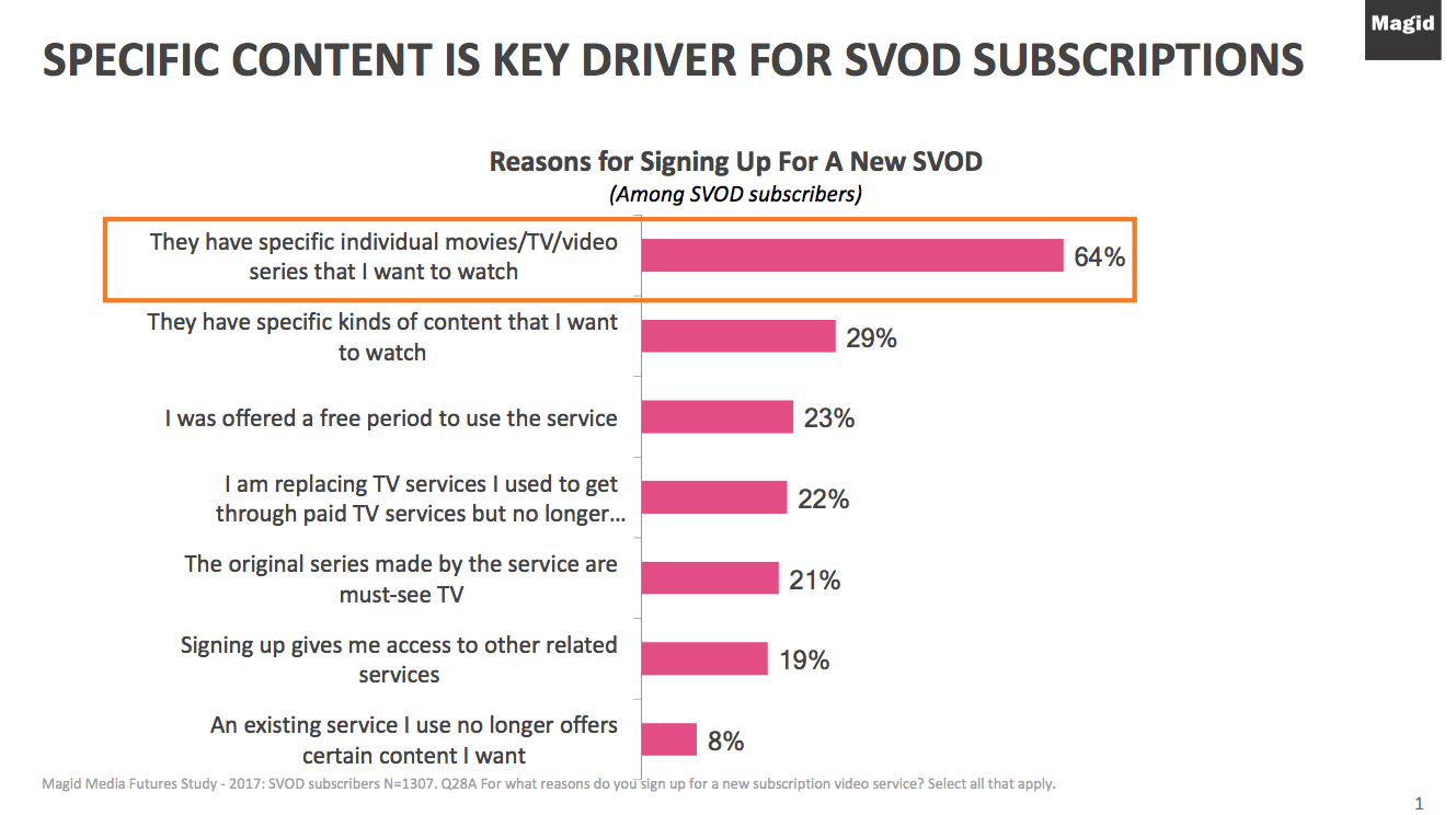 - “Specific individual movies/TV/video series that I want to watch” is the most often cited reason for selecting an SVOD service, so investment in content is critical to Netflix