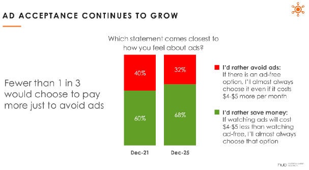 Ad-supported streaming is enhancing the viewer ad experience according to Hub’s semi-annual “TV Advertising: Fact vs. Fiction” study, which shows that more viewers than ever are opting to save money by accepting ads, and fewer viewers are saying they cannot tolerate them. According to the study, in December 2025, two-thirds of viewers would “rather save money” than avoid ads, up significantly from 2021. In addition, there’s been a corresponding increase over the past 18 months of viewers opting for a strictly ad-supported mix of subscriptions, and as of December one-third said they avail themselves of ad-supported services only, significantly higher than in June 2025.