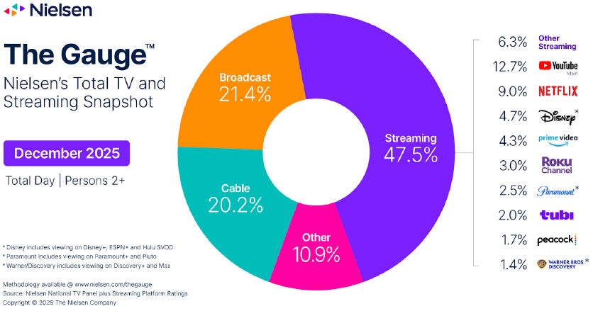 Streaming viewership captured 47.5% of television in December, the largest share ever reported in Nielsen’s The Gauge. On Christmas Day, streaming usage surged to 55.1 billion viewing minutes, up +8% from December 25, 2024. Back-to-back NFL games on Netflix followed by the release of new “Stranger Things” episodes, along with Prime Video’s late NFL game, contributed to the jump – combined, Netflix and Prime Video commanded 22.5% of total TV usage across the day. Streaming levels overall on Christmas Day accounted for a record 54% of daily TV usage. |