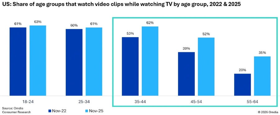 | Second-screening isn’t just a young viewer’s game anymore. More than half of US viewers ages 45–54 now watch video on their phones while the TV is on, according to a report from Omdia – up from 39% in November 2020. Viewers 55–64 aren’t channeling one screen either, with 35% reporting mobile multitasking, a 20% jump. Younger audiences still lead the scroll-and-stream set, but their habits have mostly leveled off: among 18–24-year-olds the share edged from 61% in 2022 to 63% in 2025, while 25–34-year-olds ticked up from 60% to 61%. In other words: the second screen is going gray, too. |