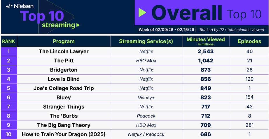 Netflix’s “The Lincoln Lawyer” rose to 2.54 billion minutes the week of February 9 to maintain the #1 position on Nielsen’s Streaming Top 10 list for the second consecutive week, gaining over 500 million minutes from the prior interval. HBO Max’s “The Pitt” rose to second place for the first time, followed by new Peacock comedy “The ‘Burbs.” |