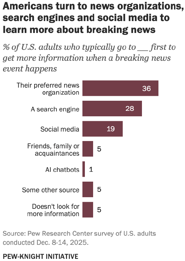 When breaking news hits, 36% of US adults say they turn first to their preferred news organization for information, according to a Pew Research Center survey conducted with the Pew-Knight Initiative. Another 28% go to search engines, while 19% head to social media. That marks a notable shift from 2018, when 54% relied on preferred news outlets, compared with 15% who used search engines and 9% who turned to social platforms. |
