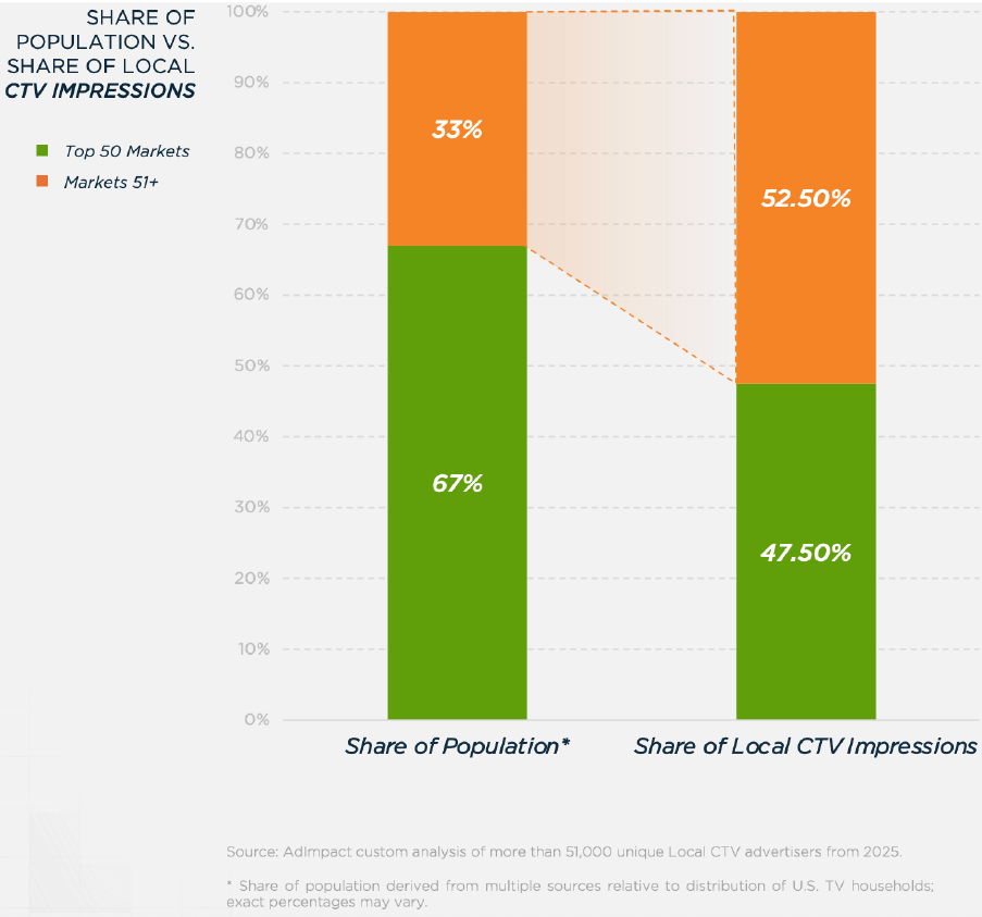 Despite representing a third of the US TV population, smaller markets are outperforming major markets, according to AdImpact’s Local CTV Ad Trends Report. Markets outside of the top 50 were found to deliver a 52.5% share of local CTV impressions, while accounting for 33% of the U.S. TV population. Additional data, analyzing over 51,000 local CTV advertisers, found: