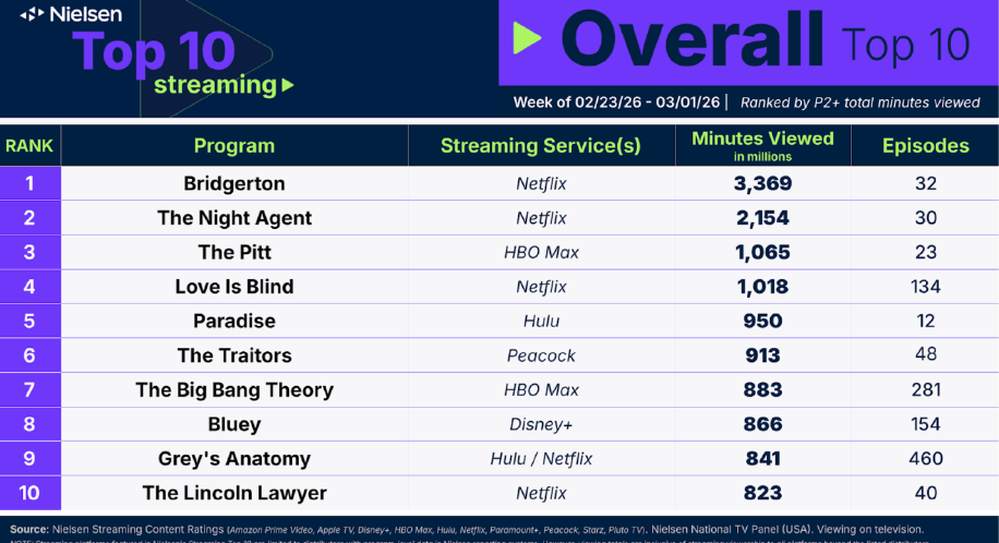Bridgerton topped Nielsen’s streaming chart the week of February 23 with 3.37 billion minutes. The final four episodes of the latest season hit Netflix on February 26, and accounted for 76% of its total viewing that week. While “The Night Agent” dropped back to the #2 spot this week, the show added 300 million minutes versus the week prior. |