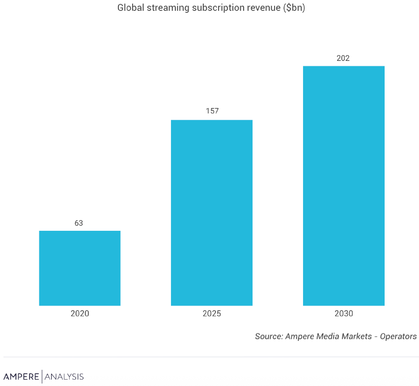 Global streaming subscription revenue rose 14% in 2025 to a record $157.1 billion, according to Ampere Analysis, up from $50 billion at the pandemic’s peak in 2020. Ampere projects subscription revenue will climb another 29% to exceed $200 billion globally by 2030. The US remains the largest driver of the sector, accounting for 50% of global streaming subscription revenue in 2025, with Netflix the largest contributor in the US market, up by 14% in revenue for 2025 following a price increase at the start of the year. |