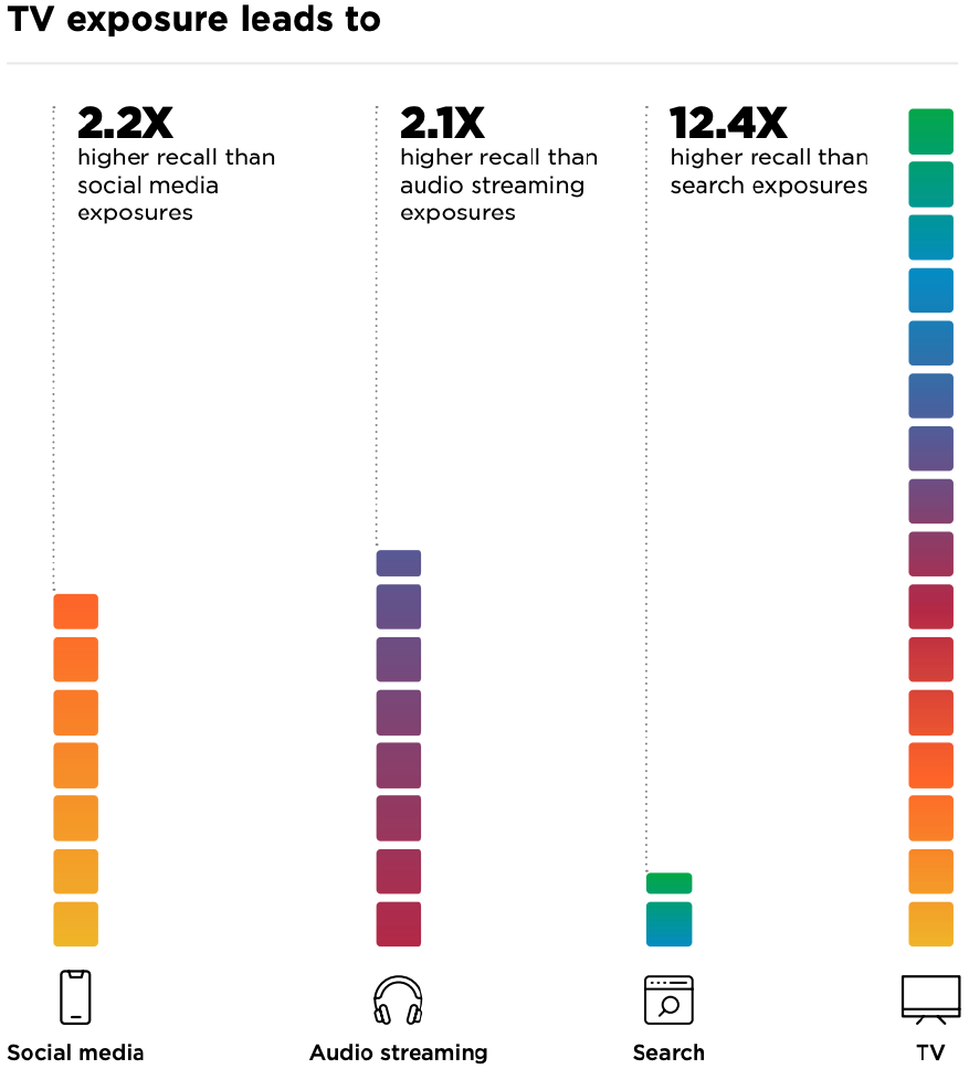 TV supercharges recall. Comcast Advertising’s TV Makes Memories study finds brand recall jumps 8.7x when TV is paired with search, 1.8x with social, and 1.6x with podcasts – far outperforming standalone channels. When TV is added to the mix: