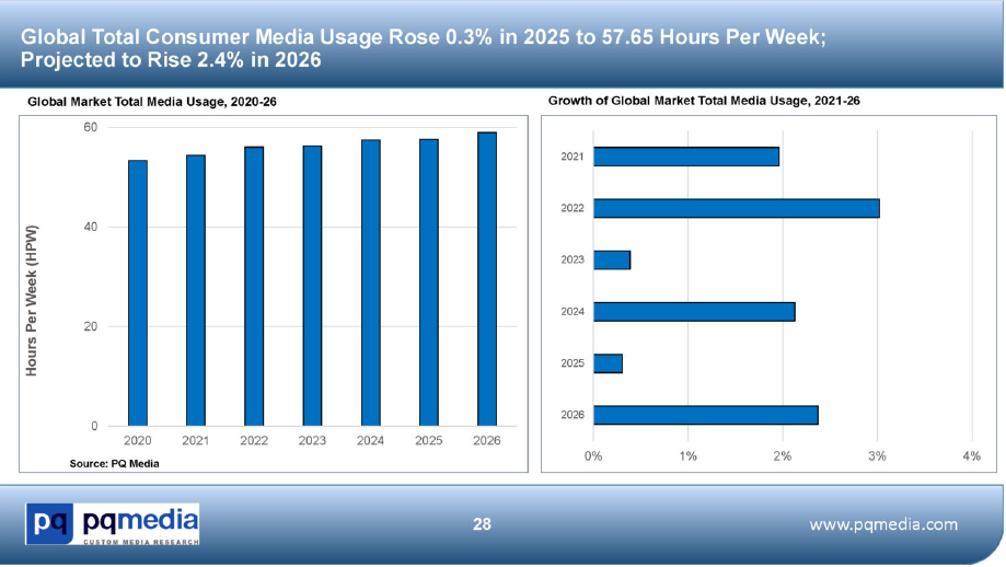Global consumer media usage rose a mere 0.3% in 2025 to an average of 57.65 hours per week (HPW), following strong growth of 2.1% in 2024, according to PQ Media’s 13th annual Global Consumer Media Usage Forecast 2026-2030. Decelerating growth in 2025 was due primarily to the lack of major international sporting events and fewer federal elections in the top 20 global markets versus 2024. Other key findings from the report include: