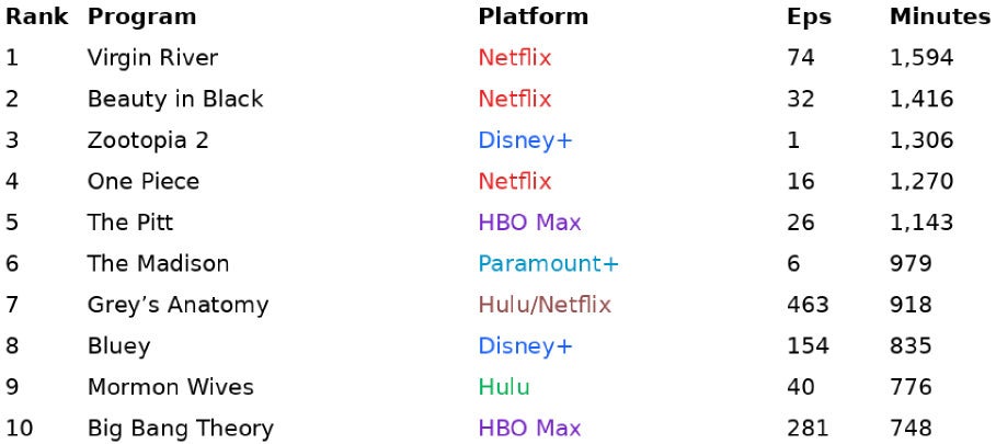 Netflix’s “Virgin River” was number one on Nielsen’s Streaming Top 10 for the week of March 16 with 1.59 billion minutes, rising from #3 in the week prior following the launch of its seventh season on March 12. With a full week of availability, the newest episodes continued to account for the bulk of the viewing (72%) with women 35+ remaining the series’ core audience (61% of watch time).