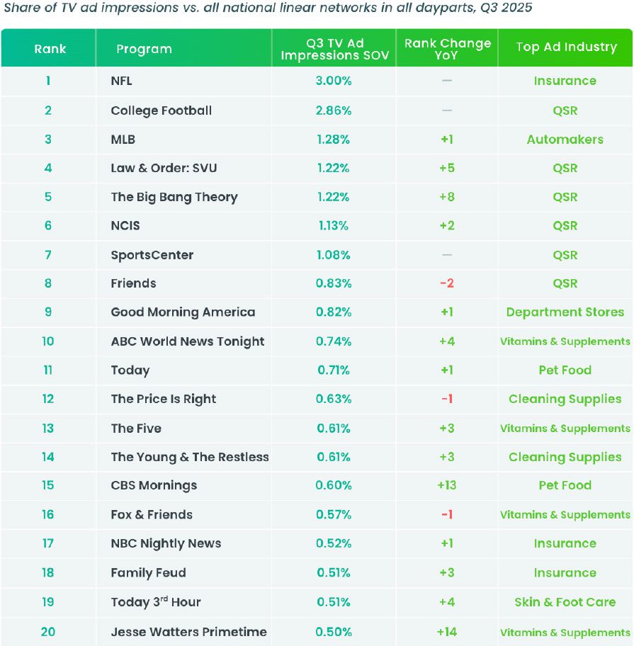 TV ad impressions for the NFL grew by over 12% year-over-year in 3Q25, and college football jumped by more than 16%, according to iSpot’s analysis of national linear TV advertising. The NFL’s estimated national TV ad spend rose by 9.7% year-over-year, and college football was up 22.5%. Additional findings include: