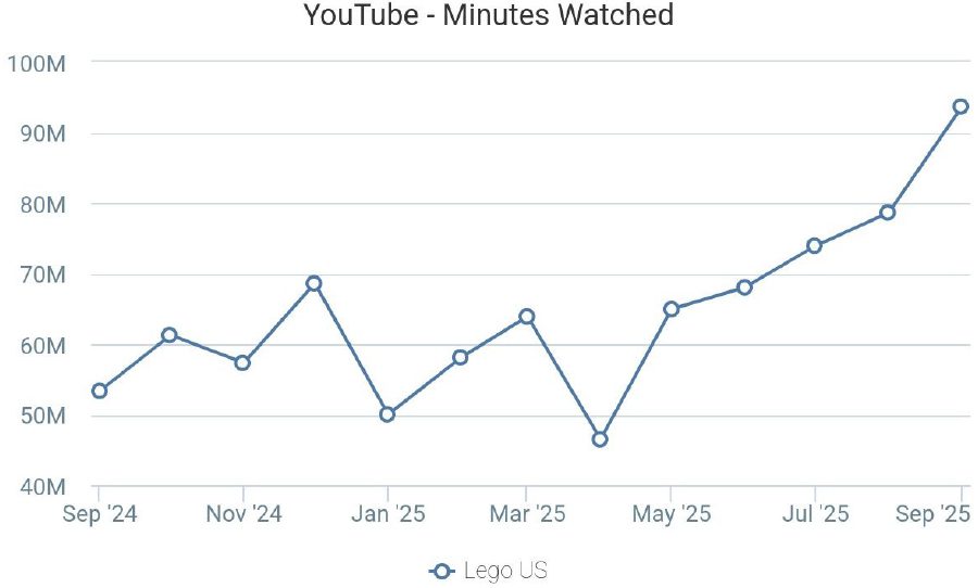 The long and short of it: Focusing on YouTube Shorts has helped LEGO hit new highs in terms of both unique US viewers and minutes watched, according to data from Tubular Labs. LEGO’s 14.1 million YouTube viewers nearly doubled month-over-month, and minutes watched grew by 19%, to 93.7 million. Last September, 16.8% of LEGO’s YouTube videos were Shorts, but this year, that number jumped to 46.3%, with videos that more resemble user-generated content. Meanwhile, to-date in 2025, iSpot data shows that LEGO has spent $6.9 million on national TV, similar to the $6.5 million spent in the time period last year. |