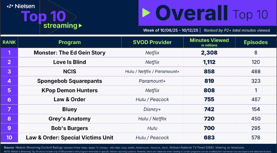 Monster: The Ed Gein Story remained atop Nielsen’s Top 10 Streaming list the week of October, generating 2.31 billion viewing minutes in its first complete seven-day interval (up 51% from 1.53 billion in its opening weekend). The series gained more young adult viewers as well, as 18-34 year-old viewership rose from 22% the prior week to 28% this week, and its core audience remained in the adult 18-49 range (61%). |