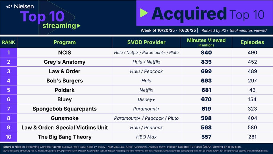 Netflix original series “The Diplomat” generated 1.24 billion minutes to secure #1 overall / #1 original on Nielsen’s streaming list in the first full week since launching its third season on October 16. Seventy-two percent of its total watch-time this week was for the newest season, with Adults 50+ (68% of the audience) as the main drivers of viewership. Although they are regulars in the Top 10, each of the top four shows on this week’s Acquired chart recently launched new seasons, and each registered increased viewership at or around the time new episodes aired. |
