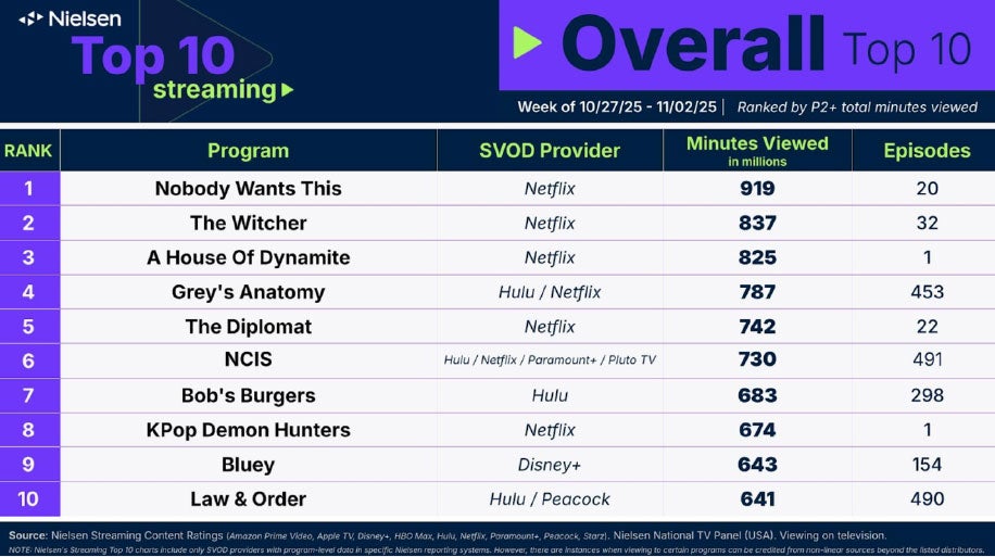 With competition from football and baseball, for the second time in October, no shows crossed the one billion minute threshold on Nielsen’s streaming chart the week of October 27. However, Netflix’s “Nobody Wants This” came close, taking the #1 spot with 919 million minutes following the launch of its second season on October 23. Season 2 accounted for 83% of the 919 million minute total, and adults 35-64 contributed 58% of watch time. |