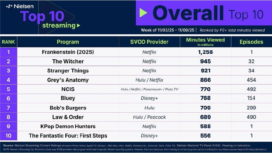| Netflix’s new film adaptation of “Frankenstein” had a very strong debut weekend, logging in 1.3 billion viewing minutes in the three days between November 7 and November 10, making it the top movie and #1 title overall during the Nov. 3-10 interval, according to Nielsen. |