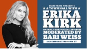 CBS will air “A Town Hall with Erika Kirk,” a one-hour town hall event moderated by CBS News editor-in-chief Bari Weiss on Saturday, December 13 at 8p. Kirk will field questions from young evangelicals, prominent religious leaders, and figures across the political spectrum.